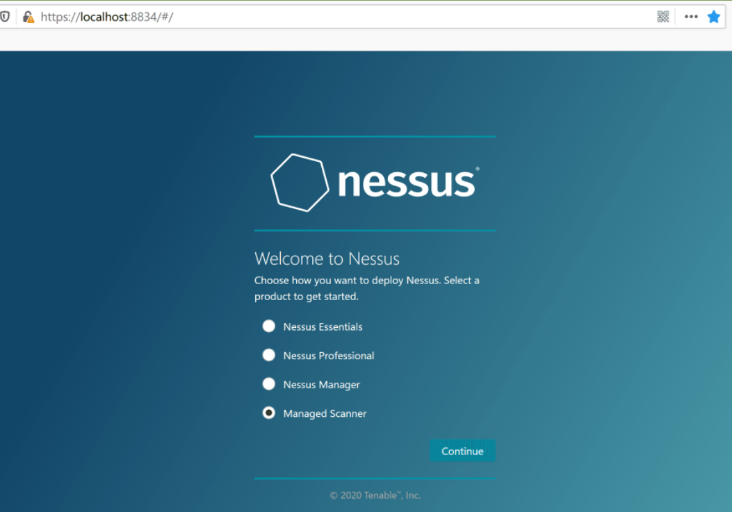 3、安装好之后,Nessus 会自动打开浏览器,进入到初始化选择安装界面,这里我们要选择Managed Scanner。