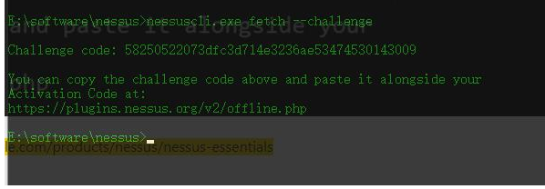 8、以管理员权限运行CMD,切换到 Nessus 安装目录,执行命令:nessuscli.exe fetch --challenge 得到 Challenge Code。(这里的Challenge Code 接下来会用到)