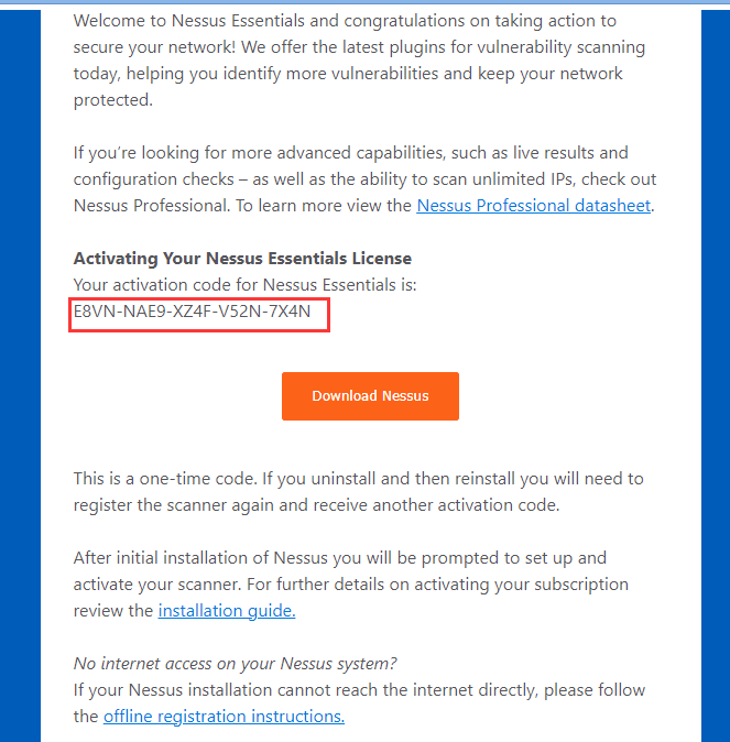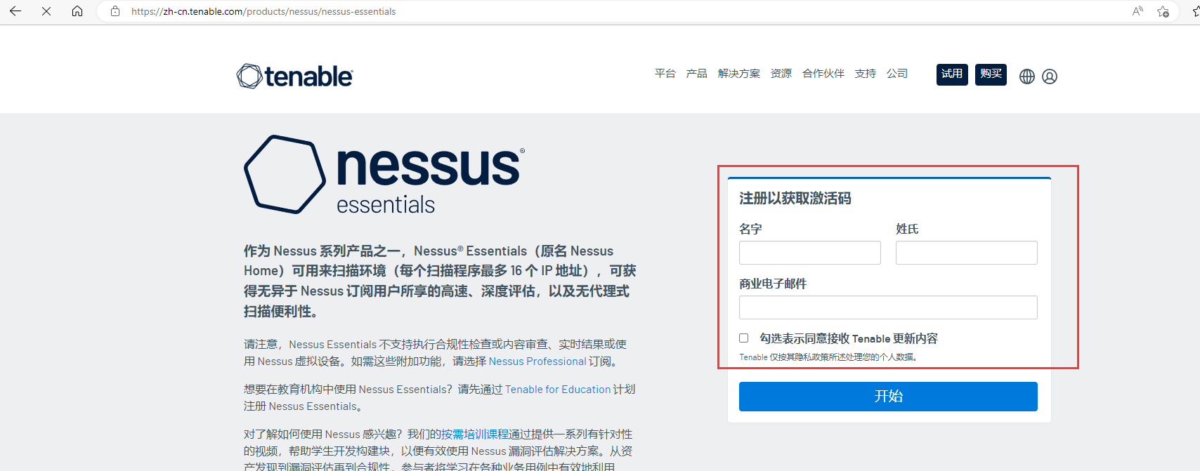 9、注册一个免费的激活码Activation Code,一会儿会用到。https://zh-cn.tenable.com/products/nessus/nessus-essentials(这里面就根据自己信息填,邮箱一定要填对,要收到一个Activation Code)