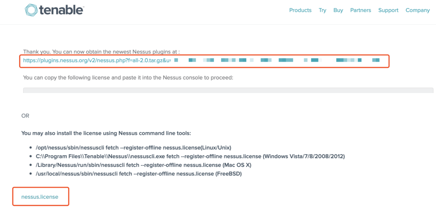 10、访问 https://plugins.nessus.org/v2/offline.php 填写 Challenge Code 和 Activation Code 获取 all-2.0.tar.gz 和 Nessus-license 文件。